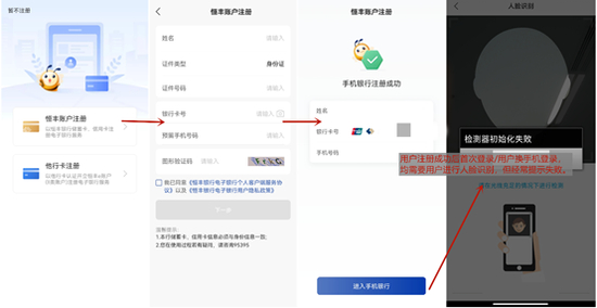 值得注意的是,本行用户自助注册的手机银行无法使用转账等功能,需要去柜面签约,但相关提示不够充分。此外,在多次测试中,持卡用户注册后首次登录经常不成功——“人脸识别”环节提示“检测器初始化失败”,也没有任何帮助入口。