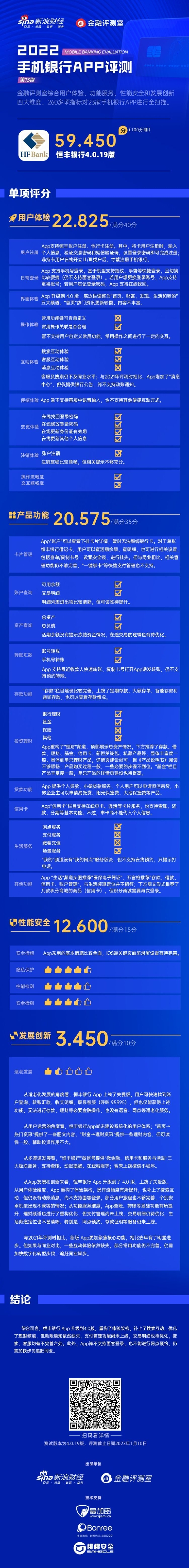新浪金融评测室综合用户体验、功能服务、性能安全、发展创新4大维度,260余项细分指标对恒丰银行手机银行App“恒丰银行”进行全扫描,最终给予59.450分(总分100)。