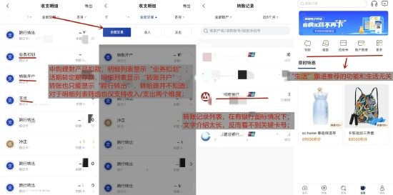 具体到“收支明细”,App支持查询近5年的交易明细,单次查询时间跨度不超过1年,且明细列表进出项比较清晰,但可读性待提升——诸如转账看不到交易对手,消费看不到商户等。此外,App仅支持按收入/支出进行筛选,不支持搜索,与同业仍有较大差距。