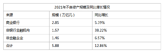 2021年,我国金融机构不良资产规模5.88亿元,同比增长12.86%,连续两年保持两位数增长。其中,商业银行的不良贷款余额从2014年的0.59万亿元上升到2021年四季度的2.8万亿,不良贷款率从2014年的1.04%上升到2021年四季度的1.73%。