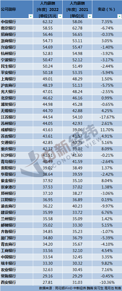 中新经纬通过同花顺iFinD数据发现,相较于2021年,A股42家上市银行中,2022年半数银行的员工薪酬上涨,超九成银行员工人均薪酬超过30万元,其中,最高的是中信银行,人均薪酬超60万元,最低的是西安银行,人均薪酬仅27万元。
