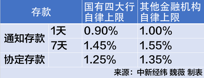 本次调整后,四大国有行1天和7天期通知存款自律上限分别为0.9%、1.45%,协定存款自律上限1.25%。其他金融机构1天和7天期通知存款自律上限分别为1%和1.55%,协定存款自律上限1.35%。
