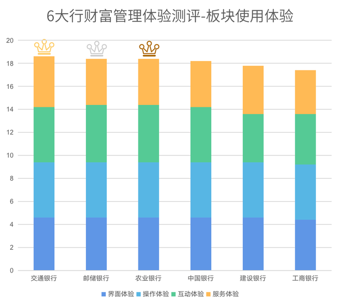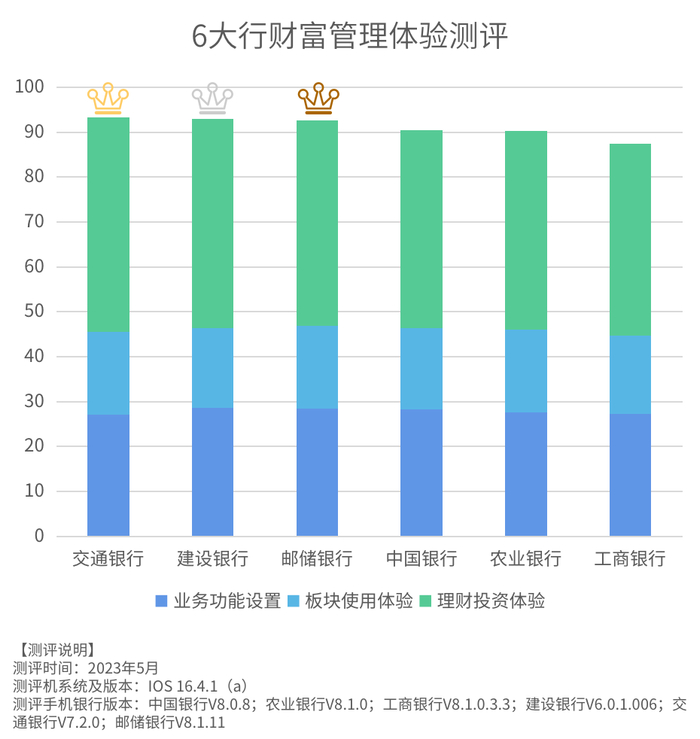 按照模型设置的指标权重和打分标准,在同等情况下开展测评,综合得出六大行手机银行财富管理板块使用体验的分数,其分数排名依次为交通银行、建设银行、邮储银行、中国银行、农业银行和工商银行。