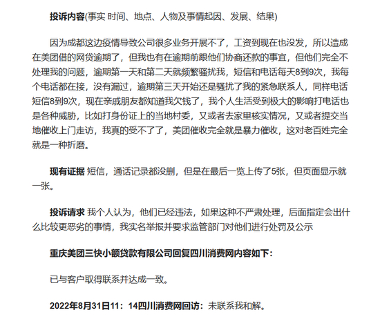 2022年9月,四川消费网报道一则专门针对美团三快小贷的投诉。投诉内容显示,消费者黄某在美团上借的网贷逾期,其在逾期前跟贷款方协商还款事宜,但美团三快小贷完全不处理问题,逾期第一天和第二天频繁骚扰黄某,短信和电话每天8到9次。黄某称,其每个电话都接并未遗漏。逾期第三天开始,美团三快小贷骚扰黄某的紧急联系人,同样电话短信8到9次,现在亲戚朋友都知道黄某欠下网贷,使其个人生活受到极大影响。