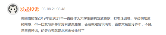 黑猫投诉平台上,美团借钱的投诉达到了33028条。内容多为委外暴力催收,爆通讯录。有消费者指称,美团借钱在2019年至2021年,一直给作为大学生的他发放贷款,打电话退息,专员明知是校园贷,但坚称美团没有退息政策。