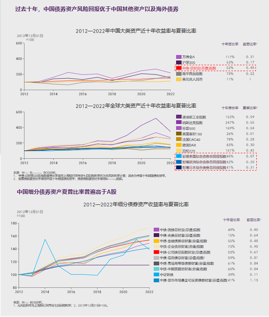 收益方面,债券投资低波稳健,风险收益最佳,是资产配置中的“基石”所在。过去十年,中国债券的夏普比率显著高于其他大类资产,同时也高于美国、欧洲、日本债券,达0.45。细分债券资产类别中,部分债券类型的十年增长率甚至超过沪深300,例如企业债、高等级信用债、中票等;夏普比例也普遍高于A股。