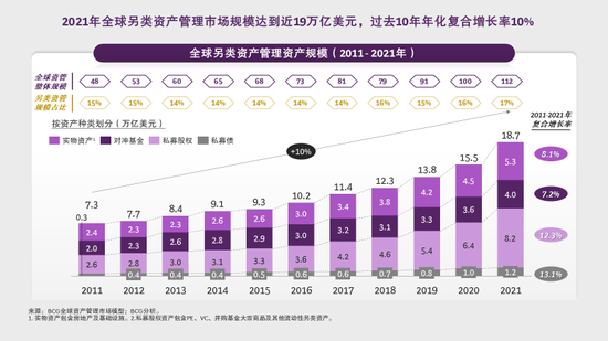 过去十年,另类资产管理快速成为全球资管市场的重要组成部分。截止2021年末,全球另类资产管理市场规模已达到近19万亿美元,年化复合增长率达10%,占整体大资管行业的比例从十年前的14%提升到17%。