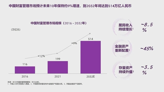 受居民收入增长、财富重新配置以及存量资产增值所驱动,中国财富管理市场过去6年保持高速增长,截止2022年末,中国居民金融资产已经达到217万亿。未来10年,我们认为中国财富管理行业仍处于蓬勃发展阶段,BCG预计中国个人金融资产将保持9%的年复合增长,到2032年中国个人财富管理市场规模将达到514万亿元人民币,财富管理市场前景广阔。