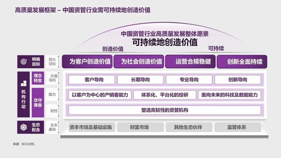 因此,我们提出高质量发展框架,期望能够助力中国资管行业明确发展方向。我们认为中国资管行业实现高质量发展的整体愿景是可持续地创造价值。