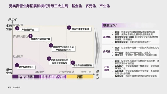 另类资管机构从早期到壮大,通常沿三大主线设定战略路径:基金化、多元化、产业化。