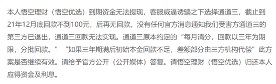 2020年12月,悟空优选曾经发布一则“多元退出通道”公告,宣称悟空优选正式退出网络借贷信息中介撮合业务,并引入持牌资管机构及服务商提供债权管理服务及多元退出通道,通道包括三种:通道一为本息全额兑换急速退出通道,按“本息余额”为基准1:1兑换商城卡券等权益,用户挑选兑换商城商品直至兑完为止;通道二为一次性转让快速退出通道,平台定期开放,用户自主出价申请转让,受让方竞价购买;折扣后大概为10%-30%。悟空优选声称,如果用户不确认通道的选择,则平台不会强制执行。