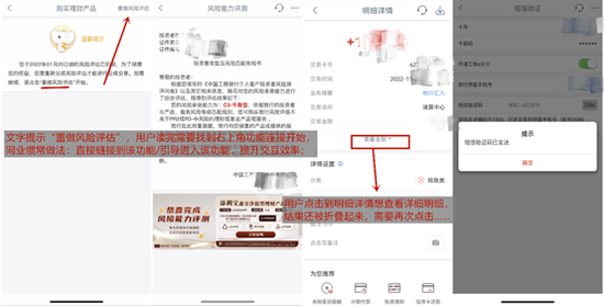 此外,App部分用户旅程的交互设置仍可优化:第一,冗余交互较多,诸如绑定手机号收款时特别提示“更安全”,部分旅程验证码发送后提示用户“确认”。第二,交互设置不够便捷,诸如用户买理财时风险评估过期,提示点击“重做风险评估”开始,但用户需在页面右上角找到功能键进行,同业一般会直接超链该功能;用户做完风险评估后,缺乏“继续购买”的引导键。第三,交互形式可优化,有很多“折叠”的交互没必要,比如“明细→单笔交易详细”,用户点开单笔交易主要是想了解更多详情,但却进行了“折叠”处理,用户还要再次点击。