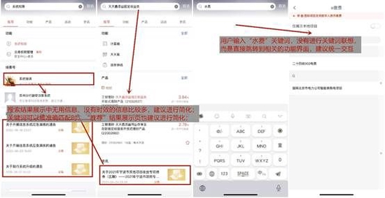 与2021年评测时相比,搜索互动进一步优化,但也有瑕疵之处:一是,搜索结果展示可以优化,比如产品名称完全匹配的情况下,结果展示可优化;二是,功能搜索的交互模式可统一,比如“生活缴费”是正常交互模式,但“水费”是直接跳转模式;三是,对活动的搜索仍可优化,个别活动搜索在测试中出现交互bug。