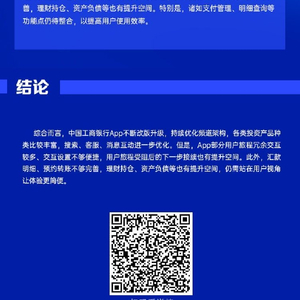 综合而言,中国工商银行App不断改版升级,持续优化频道架构,各类投资产品种类比较丰富,搜索、客服、消息互动进一步优化。但是,App部分用户旅程冗余交互较多、交互设置不够便捷,用户旅程受阻后的下一步接续也有提升空间。此外,汇款明细、预约转账不够完善,理财持仓、资产负债等也有提升空间,仍需站在用户视角让体验更简便。