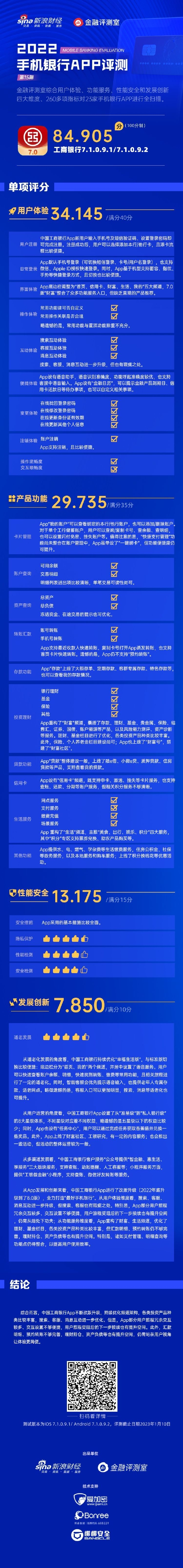 新浪金融评测室综合用户体验、功能服务、性能安全、发展创新4大维度,260余项细分指标对中国工商银行手机银行App“中国工商银行”进行全扫描,最终给予84.905分(总分100)。