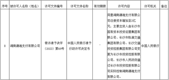 移动支付网6月2日消息,人民银行官网于近日更新非银行支付机构重大事项变更许可信息公示,信息显示,人民银行同意湖南潇湘支付有限公司(以下简称“潇湘支付”)注册资本增加至2亿元,主要出资人变更为长沙市投资控股有限公司(以下简称“长沙投控”),长沙市政府通过长沙投控实际控制潇湘支付。