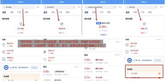不过,搜索互动也有几点可以提升:一是,诸如“预约转账”搜不到满意结果,也尚不支持搜索具体活动、保险产品;二是,“猜你想要”等搜索结果仍可更精准,比如“转账明细”只推荐到了“转账汇款”层次;三是,搜索界面体验也有升级空间。