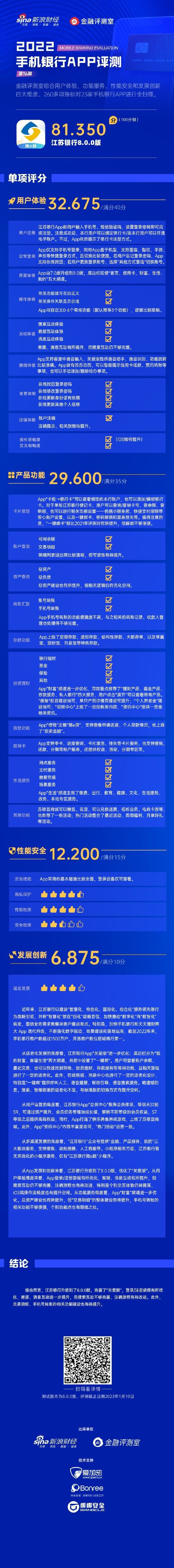 新浪金融评测室综合用户体验、功能服务、性能安全、发展创新4大维度,260余项细分指标对江苏银行手机银行App“江苏银行”进行全扫描,最终给予81.350分(总分100)。