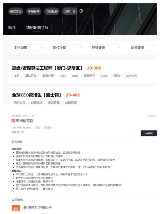 柒财经注意到,在趣店官网及猎聘网,趣店招聘的职位包括英语运营岗、全球CEO管培生,前者的主要职责为管理澳洲及其他海外地区物流司机的培训、监督及日常沟通,建立中国总部与海外外籍员工的顺畅沟通等,强调“英文流利(听说读写)”为硬性要求;后者的工作地点在纽约和波士顿,主要职责为协助业务在欧美国家的设立及客户拓展等。