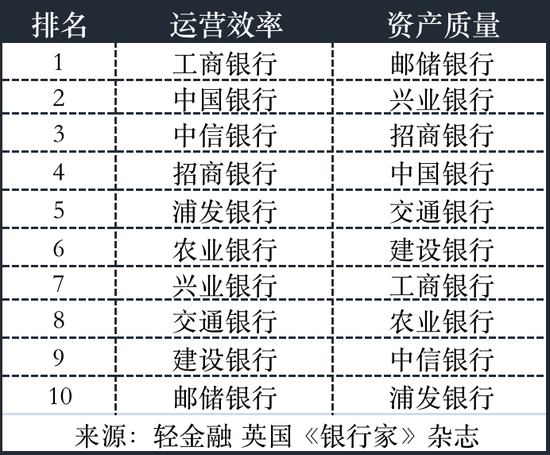 此外,在8项细分排名中,招行夺得盈利能力、风险回报、稳健性、杠杆情况等4项第一;邮储银行获得资产质量、流动性等2项第一;农业银行获得增长规模第一;工商银行获得运营效率第一。