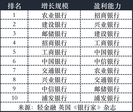 增长规模排名前五家银行分别为:农业银行、建设银行、邮储银行、招商银行、工商银行;