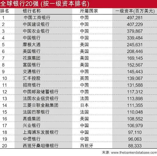 其中,中国工商银行以4973亿美元的一级资本,连续11年位居榜首,中国建设银行、中国农业银行和中国银行,这是四家银行连续第六年蝉联前四名。汇丰控股是前十名中唯一一家欧洲银行。