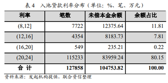 借款利率方面,资产池中加权平均贷款年利率为21.55%。根据说明书,80.15%的入池贷款利率集中在20%(不含)~24%(含),12%以下的未偿本金余额只占11.81%。