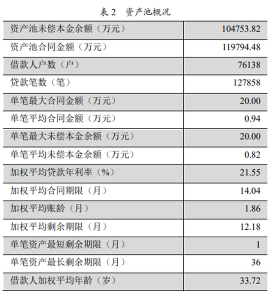 说明书显示,资产池中借款人户数76138户,贷款笔数为12.7858万笔,平均每户/人借款1.7笔;借款金额方面,单笔平均借款合同金额0.94万元,由此可知,平均每户借款金额约1.6万元。