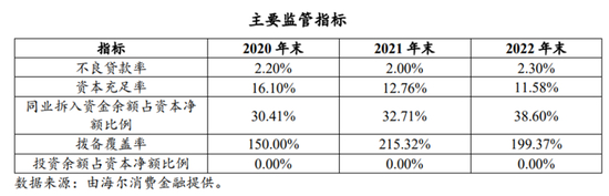 资产质量方面,截至2020末、2021年和2022年末,海尔消费金融不良贷款率分别为2.2%、2%、2.3%,不良率有所上升。过去三年,海尔消金资本充足率下滑较快,从2020年的16.1%下降至2021年的12.76%,再到2022年末的11.58%;截至2020末、2021年和2022年末,海尔消金的拨备覆盖率分别为150%、215.32%和199.37%,波动较大,一方面显示出海尔消金拨备力度较大,另一方面则反映其资产质量不太稳定。