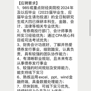 核心岗位实习生的要求越来越高,某券商债券承做实习生的应聘门槛是985或重点财经类院校的全日制研究生或已保研本科生;有券商投行部门、会计师事务所实习经验的优先;通过CPA核心科目或司法考试的优先。虽然部分券商会发放少量实习津贴或表示优秀者有留用机会,但多数券商的实习招聘信息里只是含糊的表示:能了解资本市场情况、提高研究能力、丰富实习经历等。
