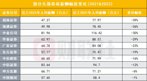 根据东方财富Choice数据,上市券商的平均年薪从2021年的59.64万元减少到了2022年的48.32万元。其中,头部券商的降薪幅度更大。招商证券(-39%)、海通证券(-36%)、中金公司(-30%)、华泰证券(-29%)、广发证券(-23%)降幅皆超过20%。
