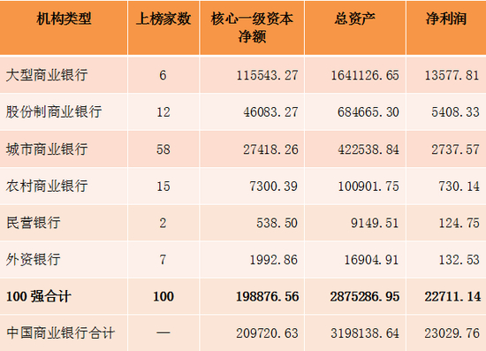 分机构类型看,100强银行包括6家大型商业银行、12家全国性股份制商业银行、58家城市商业银行、15家农村商业银行、2家民营银行和7家外资银行(详见表1),核心一级资本占比分别为58.10%、23.17%、13.79%、3.67%、0.27%和1.00%。按照银行总部所在地看,广东、北京、上海和浙江四地上榜银行最多,分别有14、11、11和10家银行,合占100强上榜数量的46.0%,占上榜银行资产的84.63%。此外,100强中有45家为上市银行,资产占比89.91%。首次上榜银行除7家外资银行外,还有山西银行、日照银行和网商银行等3家银行。