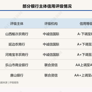 从调整情况来看,中诚信国际将山西榆次农商行的主体信用评级由2021年5月份的A-下调至BB;延边农商行的主体信用等级由A+下调至A-;河南宝丰农商行的主体信用等级由A+下调至A-。