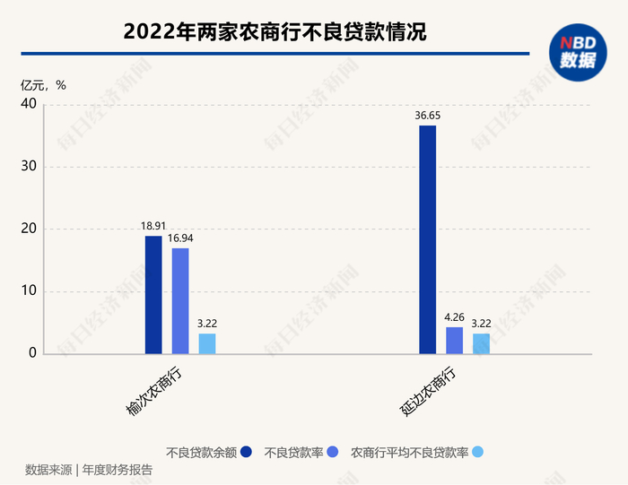 不良贷款方面,如榆次农商行2022年不良贷款余额为18.91亿元,不良贷款率达到16.94%;延边农商行(合并口径,下同)2022年不良贷款余额为36.65亿元,相较2021年翻倍,不良贷款率也由2021年的2.1%升至4.26%。