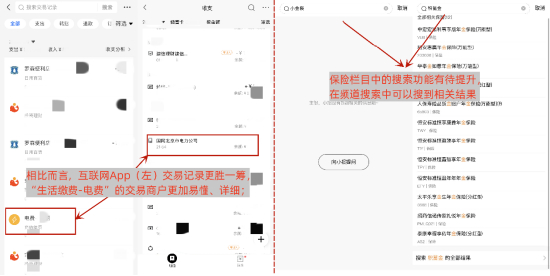 此外,“保险”栏目建设也比较完善,但该栏目中的搜索功能有待提升,比如“小金袋”搜不到结果;养老金融、黄金等栏目建设也较优。