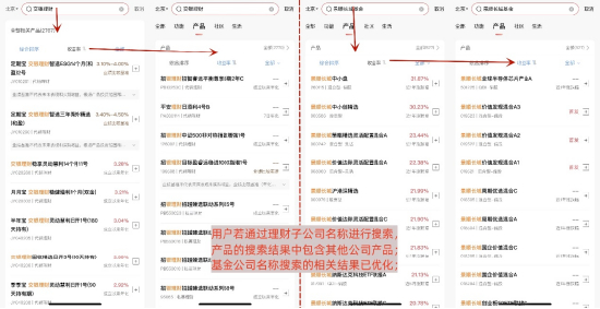 与同业相比,App对产品的搜索可圈可点,在单个产品搜索之外,可以通过公司名称搜出全部相关产品,并可以按收益率进行排序。略遗憾的是,用户若通过理财子公司名称进行搜索,结果中包含了其他公司产品(通过基金公司名称进行搜索,相关结果已优化)。