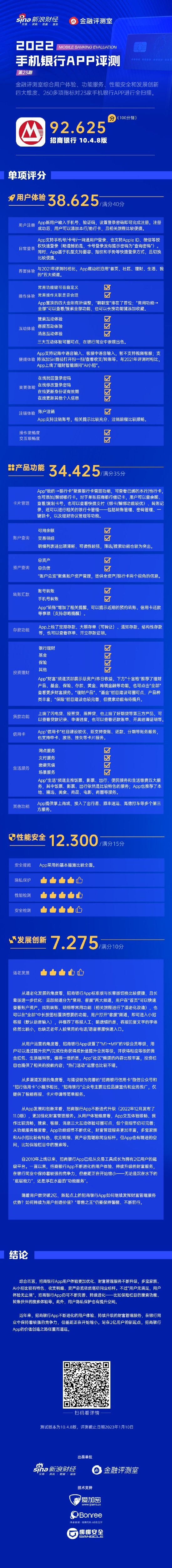 新浪金融评测室综合用户体验、功能服务、性能安全、发展创新4大维度,260余项细分指标对招商银行手机银行App“招商银行”进行全扫描,最终给予92.625分(总分100)。