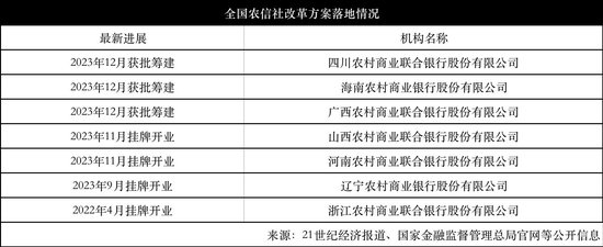 1月5日,国家金融监督管理总局官网披露,同意筹建广西农村商业联合银行股份有限公司(下称“广西农商联合银行”)、海南农村商业银行股份有限公司(下称“海南农商行”)、四川农村商业联合银行股份有限公司(下称“四川农商联合银行”)。