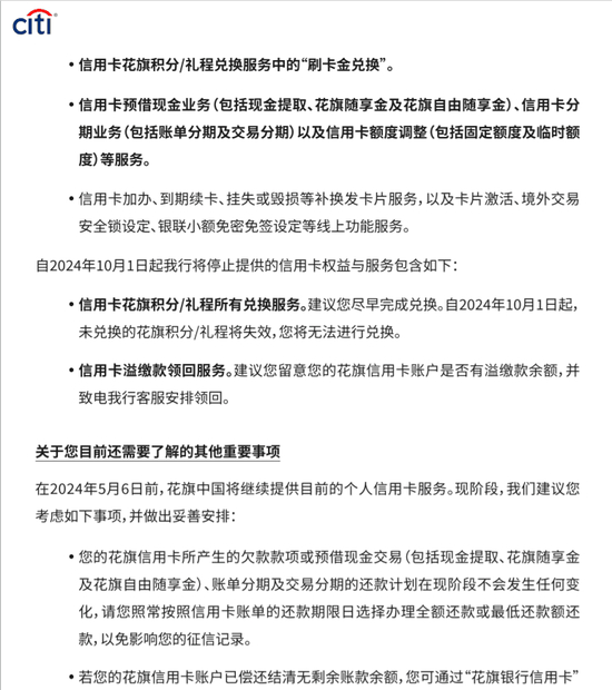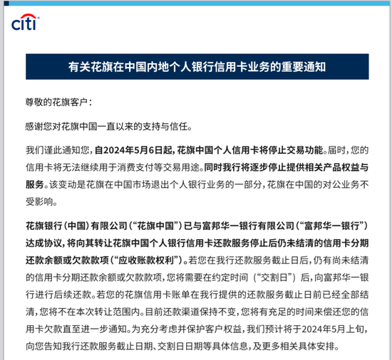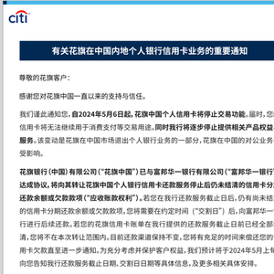 花旗银行(中国)今天官网宣布,花旗信用卡即将于5月6日停止交易功能,并逐步停止提供相关产品权益与服务。同时花旗银行(中国)与富邦华一银行签署协议,在花旗信用卡停止还款服务之后的还款及分期还款服务将由富邦华一银行负责,即5月6日之后还有分期还款余额或因消费使用的欠款款项,将还至富邦华一银行。