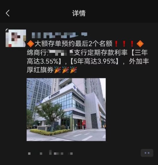 绵阳商业银行成都市某支行客户经理称,目前3.95%和3.55%利率的存单已基本饱和。“我们支行原计划做10个亿,现在已经9亿多,仅剩几千万的额度。后续如果额度约满或降息,就没办法以这个利率存了。”