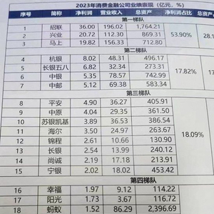 近日,一份消金公司利润统计表在业内流传,该表格统计了28家消金公司2023年的业绩情况,多位业内人士证实,表格数据基本准确。这当中,重庆蚂蚁消费金融公司的业绩数据引发关注,作为资产规模行业第一的公司,外界对其业绩状况期待很高,净利润情况没有进入行业三甲让外界感到意外。公开信息显示,蚂蚁消金于2021年开业,两年内连续增资至230亿。