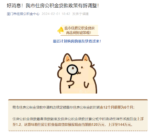 2月1日金融一线消息,厦门市住房公积金中心今日发布关于优化住房公积金贷款有关事项的通知。根据通知,厦门市住房公积金贷款申请前连续足额缴存住房公积金的时间由12个月调整为6个月;住房公积金贷款最高贷款额度及住房公积金贷款计算公式中的流动性调节系数阶段上浮至1.2,这意味着住房公积金最高贷款额度将由当前的120万元,上浮至144万元。