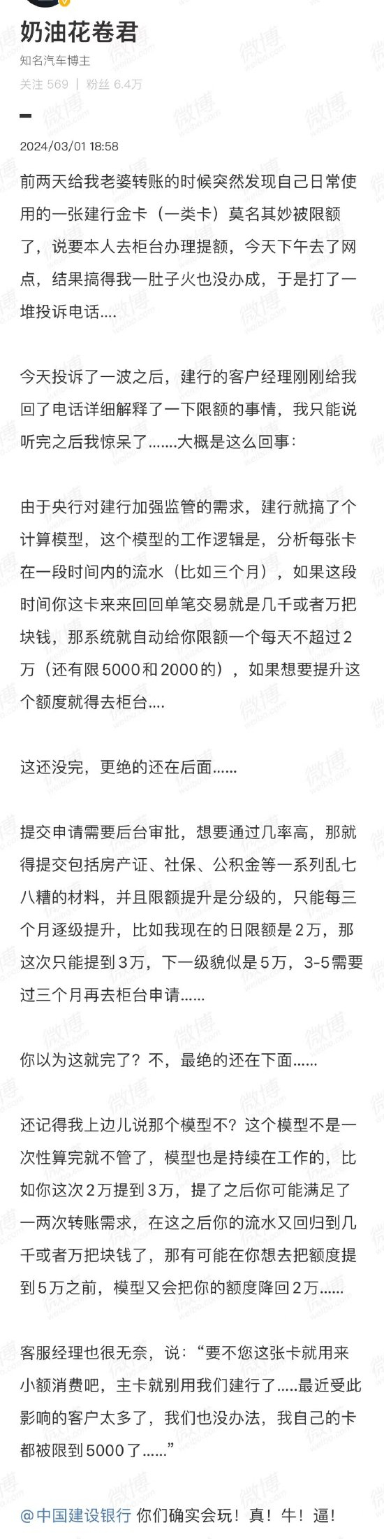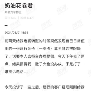 昨日,有微博网友吐槽称,他日常使用的一张建行金卡突然被限额,要求本人去柜台办理提额。然而他去网点办理没有成功,于是打了投诉电话。