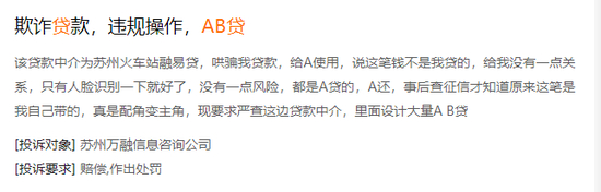 在多个投诉平台,柒财经注意到,涉及“AB贷”的投诉并不少。在黑猫投诉上,一位受害者表示,自己就是被彻底“套路”了。其在黑猫投诉上发起向沈阳某公司的维权,称朋友因征信不好,找其收款。贷款中介在办理的时候,隐瞒真相、虚构事实,以联名贷款的“幌子”,诱导其签了一堆合同文书。实际上,贷款中介把他做成了单独借款人,和朋友没有丝毫关系,但贷款下来的钱,已经被朋友拿走了,该贷款中介收取4万元的服务费。