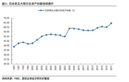 1998年之后,日本银行业的重组核心是提升经营能力和国际竞争力,按市场化原则重组,主要是都市银行间的重组,前五大银行总资产市场份额提升至60%以上。全球金融自由化越演越烈,1999年美国通过了《金融服务现代法案》,美国大型银行国际竞争力大幅增强。相比较,日本银行业深陷房地产泡沫破灭的泥潭,国际地位大幅下降。为了走出困境,同时也为了应对国际全能型银行的竞争,掀起了日本银行业大规模合并浪潮。日本11家都市银行经过一番分化组合后形成现在的5大银行,分别为三菱日联(MUFG)银行、瑞穗银行、三井住友银行、大和银行(Resona Bank)和崎玉里索纳银行(Saitama Resona Bank)。