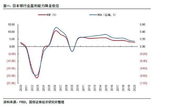泡沫破灭后日本银行生存艰难,陷入亏损。根据日本银行业协会统计,2000年至2003年日本银行业连续四年亏损,直到2004年全球经济开始复苏,日本银行业才迎来喘息之际,扭亏为盈。但2008年的次贷危机再次使得日本银行业陷入亏损。次贷危机之后日本银行业ROA基本维持约0.3%,ROE基本维持在约5.0%,盈利能力不强但比较稳定。