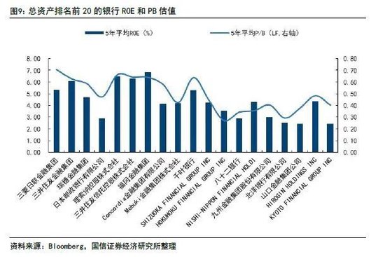 日本大型银行在盈利和估值上都更具优势。我们选取东证银行指数中过去5年数据完整的76家银行为样本,可以看到日本大型银行盈利能力明显好于中小银行,相对应的大型银行PB估值也高于中小银行。在长期低增长低利率大环境下,日本并没有出现小而美的银行,主要是日本低利率低增长环境下,银行主要靠海外市场和综合化经营保持盈利,中小银行并不具备优势。