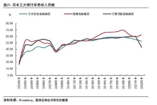 收入结构上,日本银行业非息收入占比持续提升。以日本三大银行为例,非利息收入占净收入比重从2000年初的约20%提升至近年来的约60%。