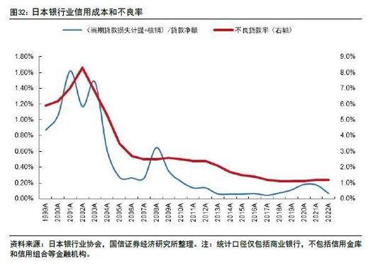不良处置付出了巨大成本,但轻装上阵后的日本银行业才有了生存下去和优化经营策略的机会。日本都市银行强强联合,地方银行间也不断合并求生,而非传统的好吞坏或者强吞弱的形式,日本11家都市银行经过一番分化组合后形成5家,日本前五大银行总资产份额从1996年的38.8%提升到了2017年的64.4%,抗风险能力和综合化经营能力提升。一方面,伴随企业竞相出海,日本银行也逐步加大了海外业务布局。2023年3月末,三菱日联金融集团、三井住友金融集团和瑞穗金融集团海外贷款占比分别达到35.1%、40.2%和38.50%,2022财年海外业务分别贡献总收入的58.5%、34.0%和53.1%。另一方面,日本银行业积极探索综合化经营,发力中间业务和交易业务,三大行非利息收入占净收入比重从2000年初的约20%提升至近年来的约60%。并且日本银行对贷款投放和资产配置都采取更谨慎的态度,信用成本和不良率长期在低位运行。