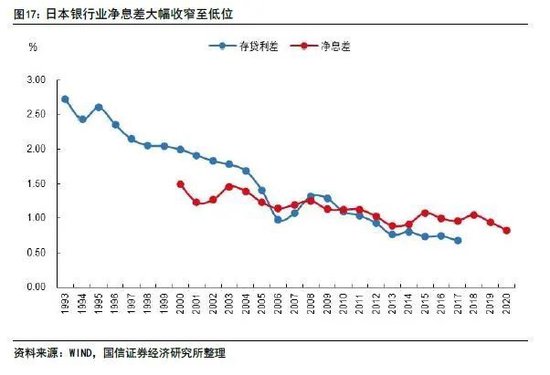 净息差收窄至1.0%以下,盈利能力大幅减弱。房地产泡沫经济刺破后,日本长期陷入低利率低增长的环境,银行业贷款利率大幅下降。但由于存款降至零利率后(甚至无法完全降到零利率水平),没办法继续下降,因此日本存贷利差大幅收窄,从1993年的2.72%一路降至2017年的0.67%,相应的日本银行业净息差也从2000年的1.49%降至2020年的0.82%。加上经济低迷,实体部门信贷需求疲软,日本银行业无法通过规模扩张来对冲净利息的收窄。泡沫破灭前,日本银行业净利息收入占净收入比重约为80%,净息差的大幅收窄给银行业带来了巨大冲击。